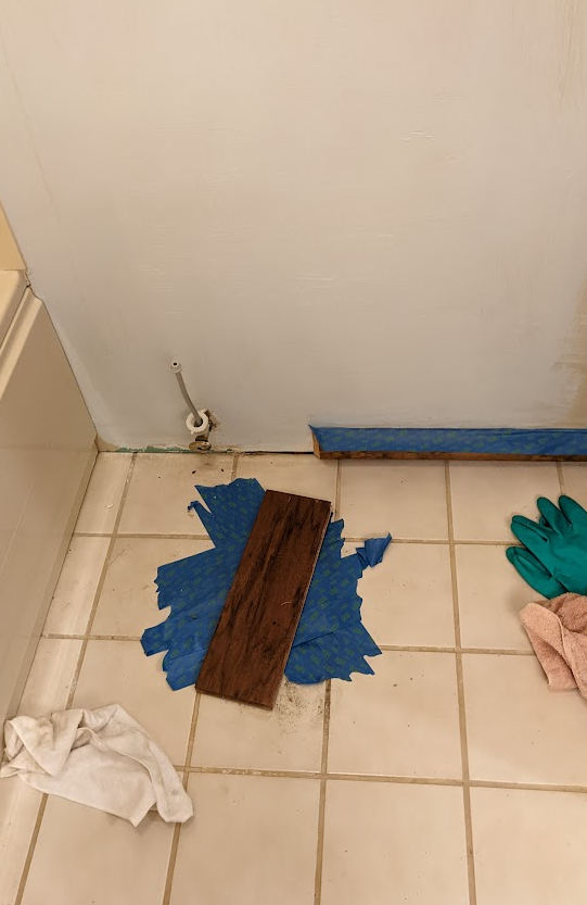 This leak originates from the Sockeye Bathroom above, and the toilet hole in particular. Again, a plumber’s problem. Once the Sockeye Bathroom is no longer in shambles, we will turn this box back into a half-bath. Until then, its constituent parts live scattered around the boyfriend’s mancave.