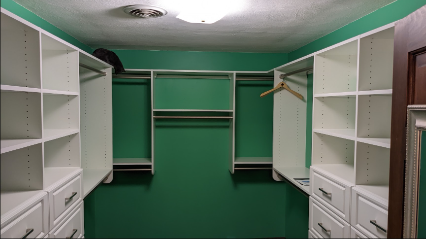 Closet! New closet. Formerly the site of bare walls and lots of boxes on the floor. We painted like a million (two) years ago and just now finally got around to hiring a professional to put in storage. Hurrah. My boyfriend made me negotiate for a portion of “his” drawer space, even though this schmuck wears copies of the same white t-shirt every single day of his life, like a cartoon character from low-budget TV.
