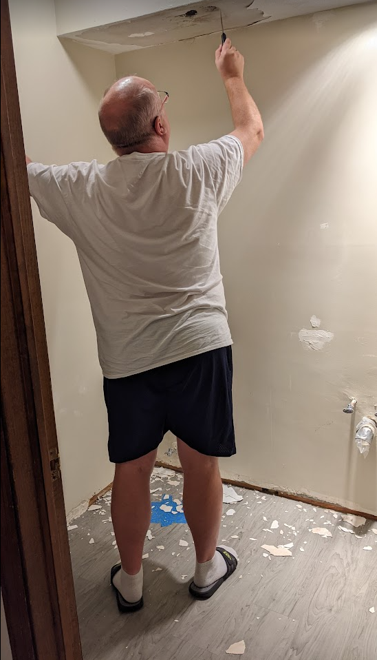Continuing to problems downstairs. Kind of doing these in reverse chronological order. Here is a bathroom that is currently just a box, with my boyfriend knocking a hole in the ceiling: