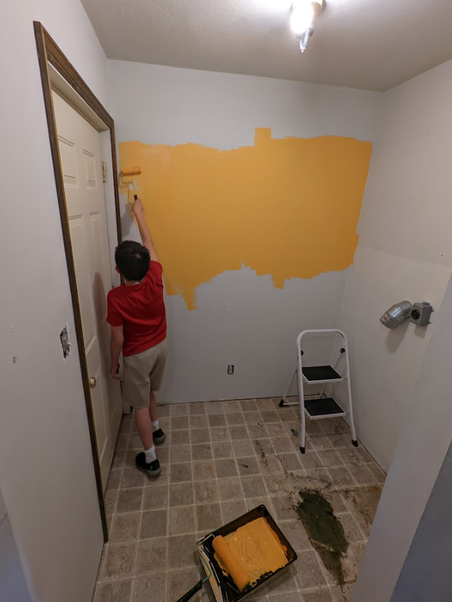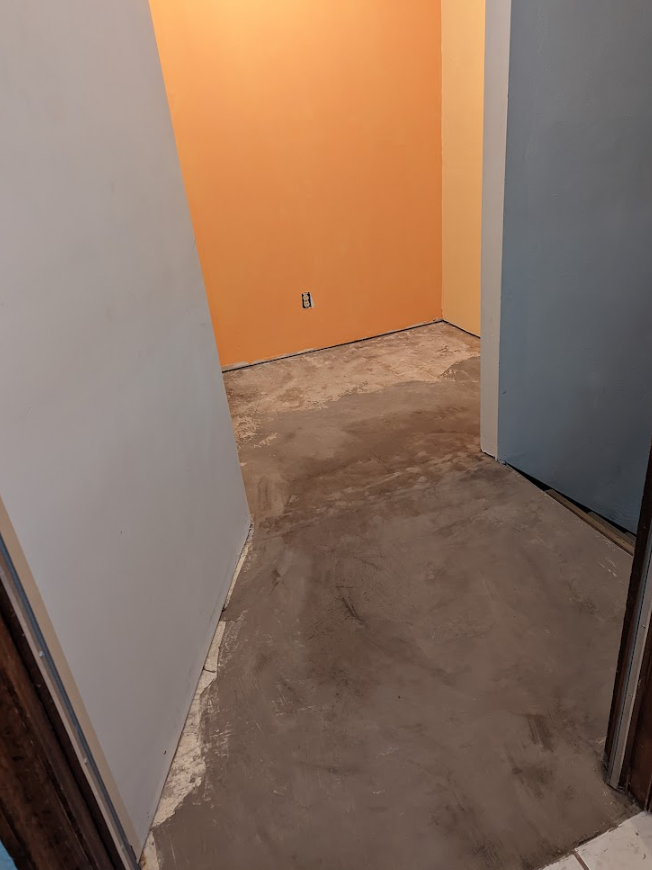 Let’s end on a positive note with another fixed problem. Here is what used to be a particularly scungy laundry room, mid-paintjob, and carpeted in self-leveling concrete (to fix a massive drop in the floor):