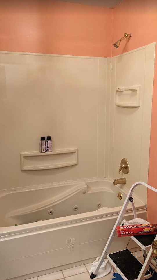 Look! A bathroom with fresh paint! Lovely. There is an entire saga of schlock behind the necessity of painting this bathroom, but we’re going to focus on my achievements with “Sockeye” latex paint, since I don’t have any control over the rest. It makes me want to bite something.
