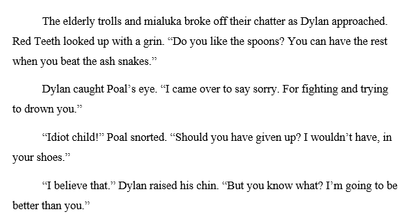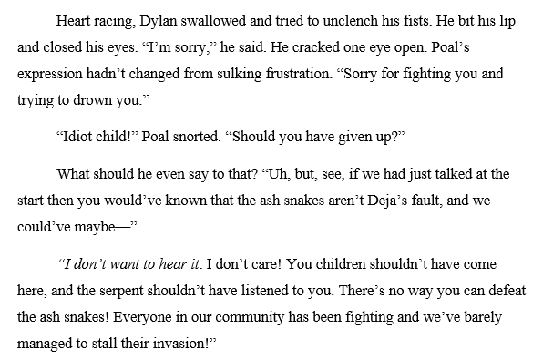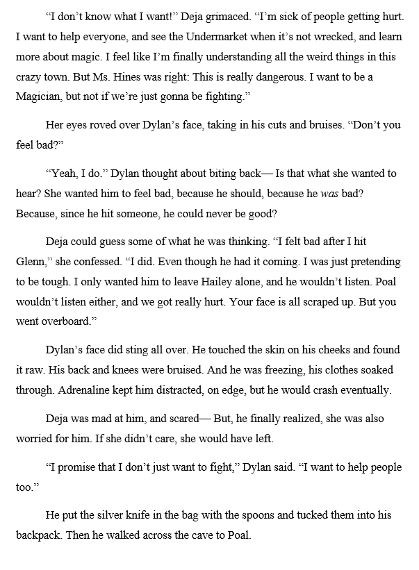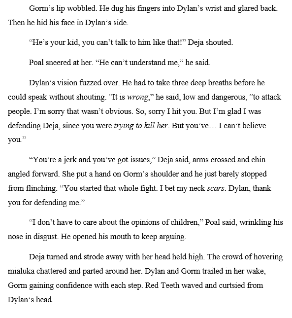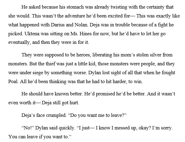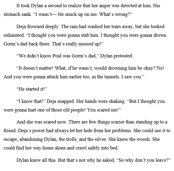 But the beta reader that I showed the new version to didn’t feel like anything was missing. Wrapping up Dylan’s character arc satisfactorily was the most important job for this scene, not showing how Poal poisoned his relationships. Meanwhile, Dylan’s most important relationship is with Deja, who deserved more of the limelight.