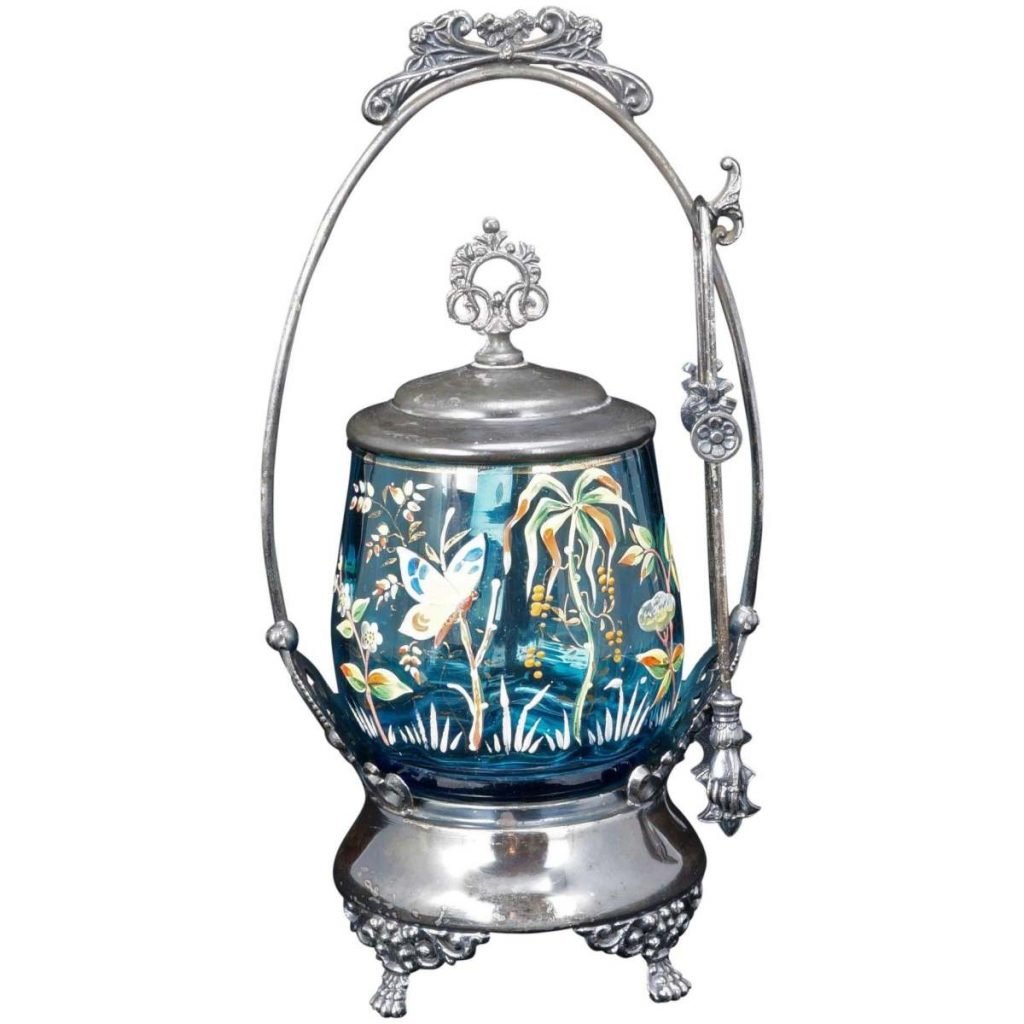 The fork was a key clue (most sets had tongs, as does the one pictured). These lanterns were actually pickle castors, which a genial salesman patiently explained to us. They were of course status symbols, used as centerpieces on dining tables during the Victorian era, more than a century ago.